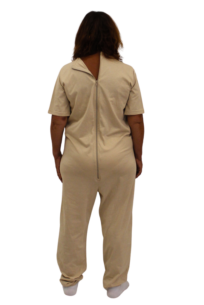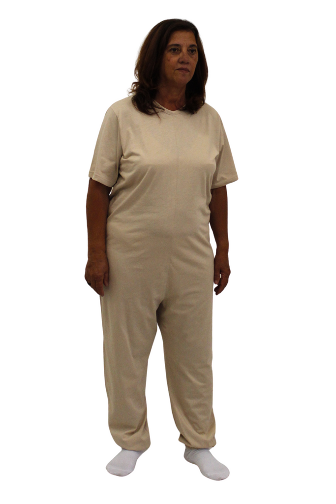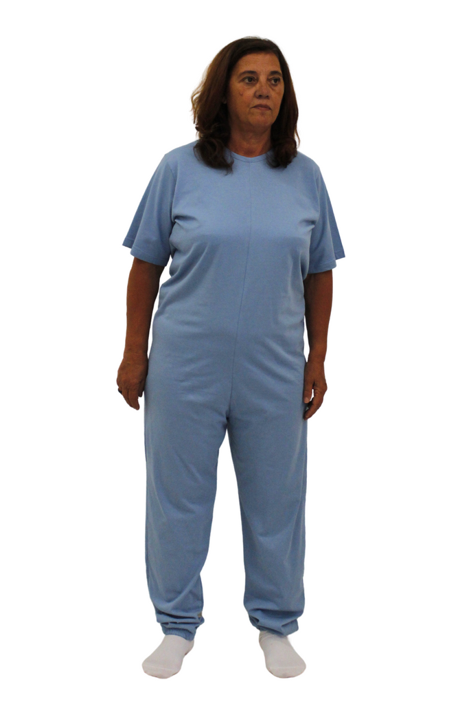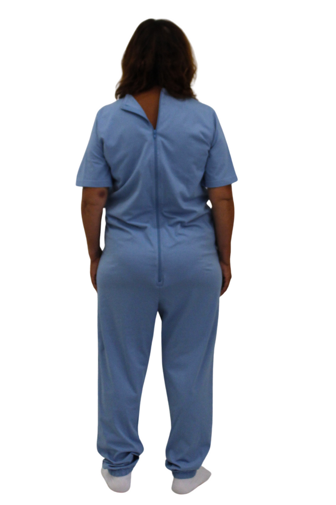 Pigiama sanitario girocollo in 100% Cotone dotato di cerniera posteriore, manica corta e pantalone corto. Ideale per la stagione primaverile ed estiva, garantisce comodità e previene la rimozione accidentale del pigiama da parte del paziente.
