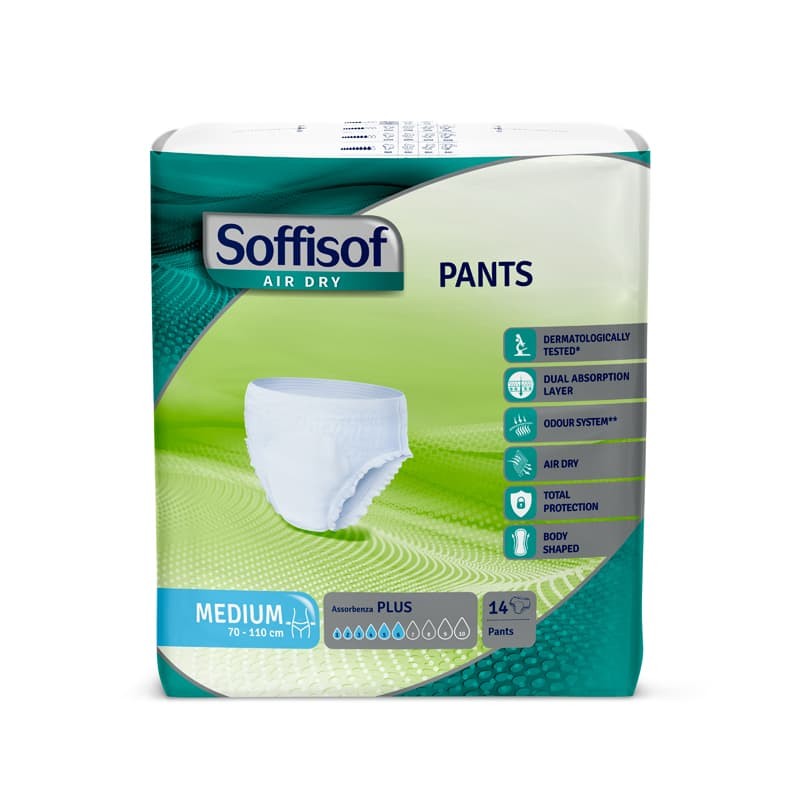 Soffisof Air Dry Pants Plus è una mutandina assorbente monouso ideale per pazienti deambulanti, autosufficienti e attivi, con perdite moderate. Facile da indossare come la normale biancheria intima. Discreta, confortevole e silenziosa.