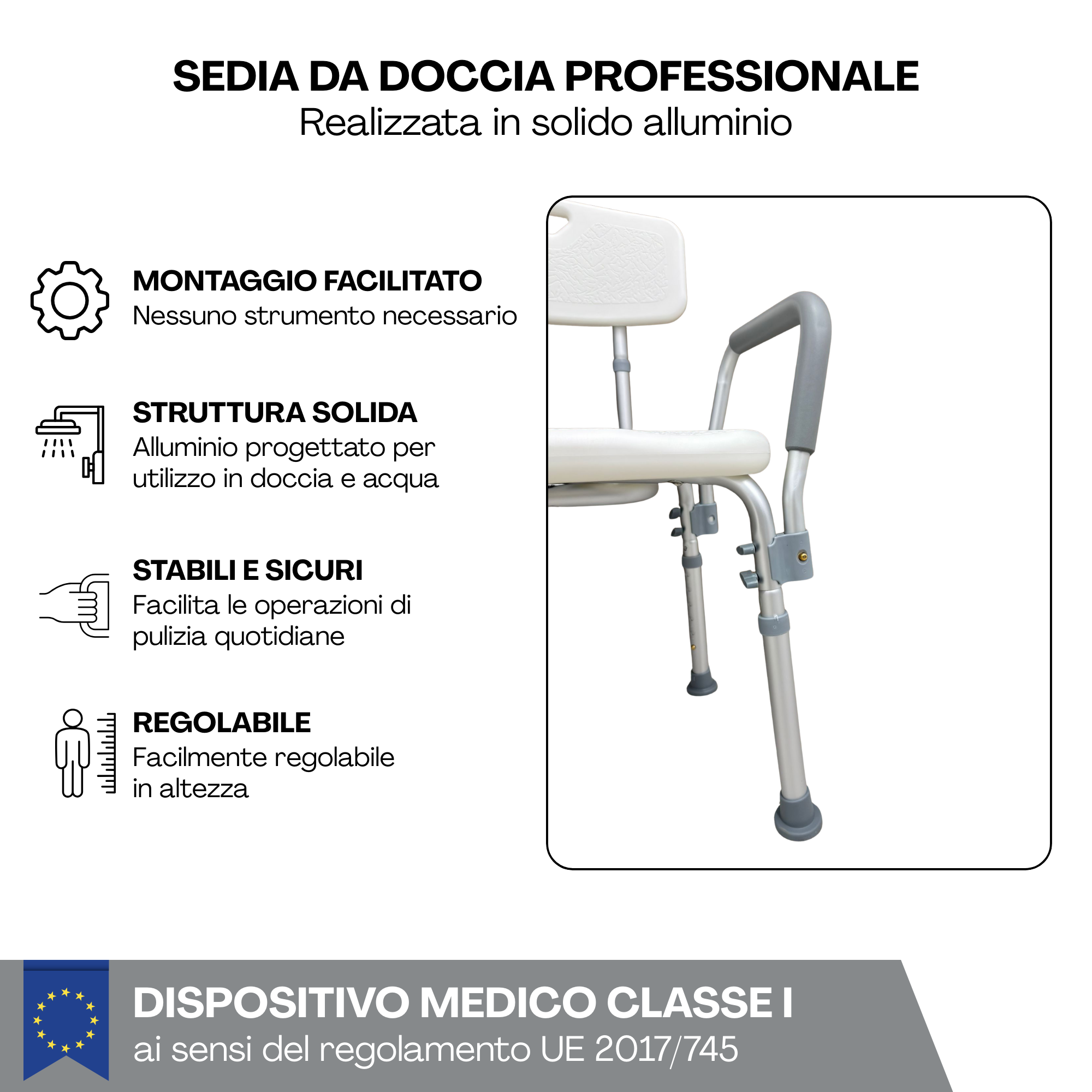 La nostra sedia per doccia è un Dispositivo Medico di Classe 1, studiato per un uso professionale e domestico. I manici ergonomici integrati offrono una presa solida per sedersi e rialzarsi in totale autonomia, mentre lo schienale garantisce una postura corretta durante il lavaggio.