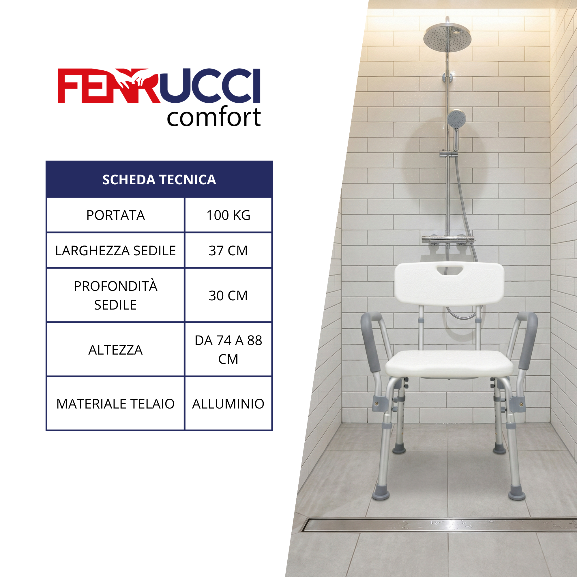 La sedia da doccia Ferrucci Comfort è progettata per offrire il massimo supporto a persone anziane o con mobilità ridotta. Grazie al telaio in alluminio leggero e alla seduta ergonomica, trasformi la doccia in un ambiente protetto, prevenendo il rischio di scivolamenti e riducendo l'affaticamento.